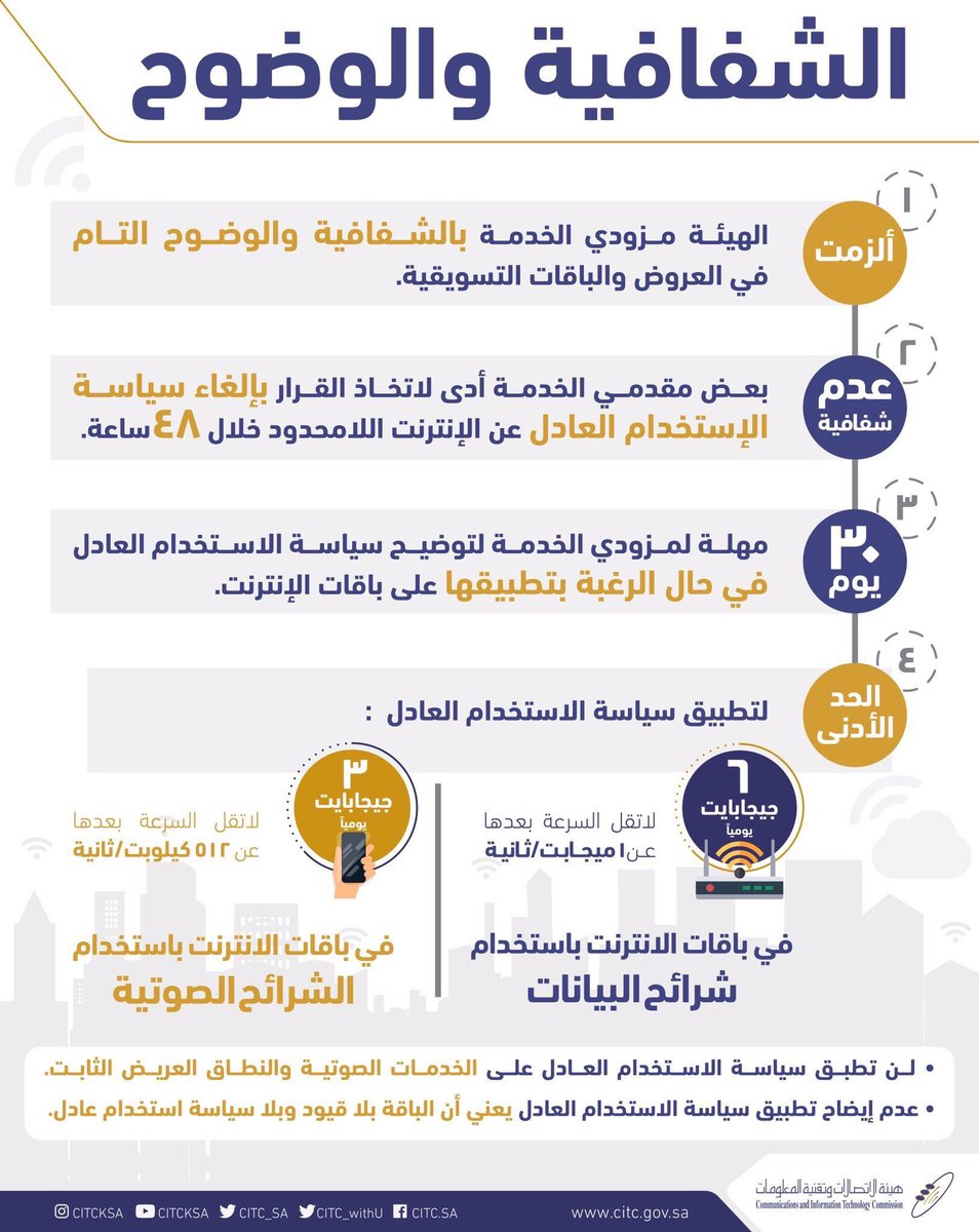 وأمهلت الهيئة جميع مزودي الخدمة – فيما لو رغب المزوّد في تطبيق سياسة الاستخدام العادل على الباقات الحالية أو المستقبلية – مهلة أقصاها (30) يومًا لتوضيح سياستها لجميع المستخدمين بشفافية تامة، وتمكين المستخدمين من الاشتراك بالباقة الأنسب لهم، وأن عدم إيضاح سياسة الاستخدام العادل للباقات المُتضمنة لهذه السياسة تعني أنها بلا قيود وبدون تطبيق سياسة الاستخدام العادل.